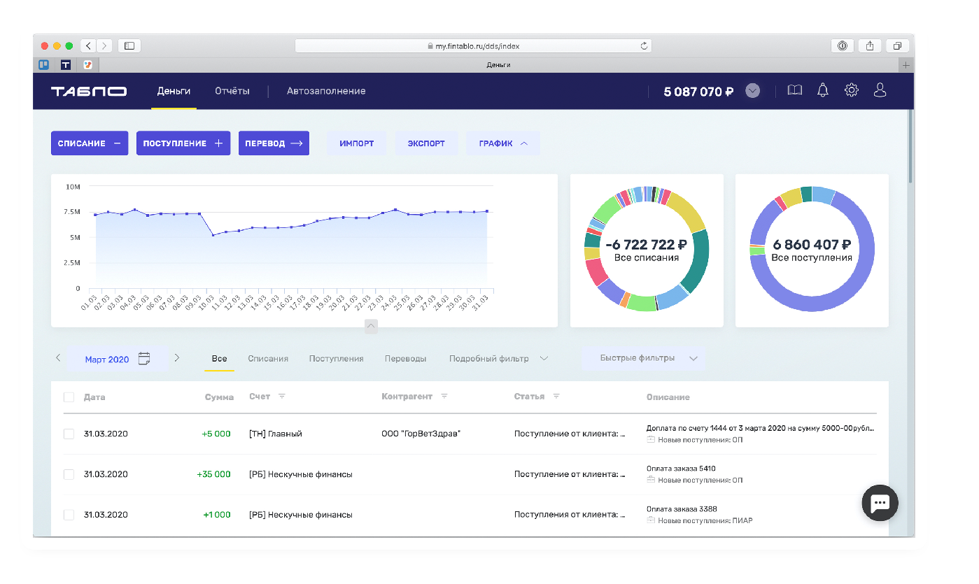 Операции с расчетного счета сами бегут в сервис, а потом складываются в удобную статистику и показательные графики. Вам остается только делать то, что должен руководитель — принимать решения. А рутину делать не остается.